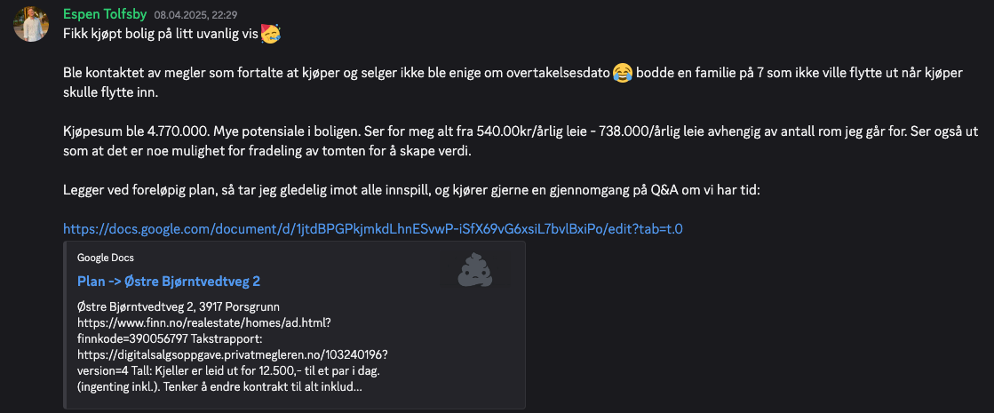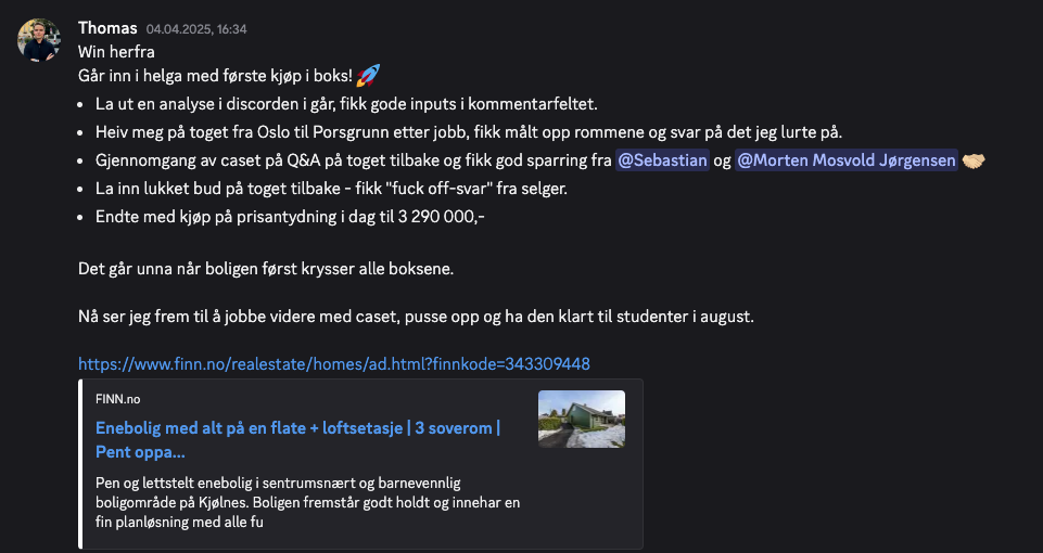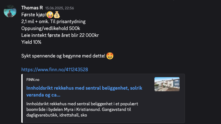 "Eiendomsmalen er en utrolig god kilde til kunnskap og nettverk innenfor eiendom. Jeg syns videoene er enkle å forstå, fornuftig bygget opp og gir meg verktøyene jeg trenger. Dette treffer andre som ønsker å utvide allerede eksisterende portefølje eller gjøre sitt første kjøp. Gjennom Q&A, men også Facebook/Discord gruppe, får man muligheten til å prate med og stille spørsmål til Morten, og andre med mye erfaring, om råd for egen vei videre. Dette har for eksempel hjulpet meg med å forstå risikoene ved mulige deals og dermed gjort meg trygg på hvilke som er verdt å gjennomføre og ikke. De siste 4 mnd har jeg kjøpt 2 nye utleieboliger(her var det så klart en sunn egen økonomi i bunn) og på grunn av kunnskapen jeg har fått fra Eiendomsmalen så føler jeg meg veldig trygg på at kjøpene var gode og jeg har en konkret plan for videre utvikling av dem og veien videre deretter. Anbefaler sterkt å bli med dersom du kunne tenke deg en fremtid innenfor eiendom, spesielt utleie."